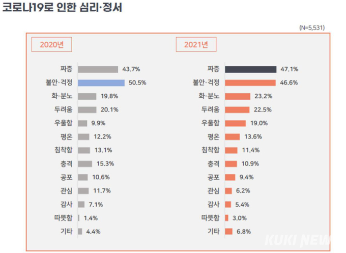 코로나19로 인한 심리정서에서는 짜증(47.1%), 불안‧걱정(46.6%)을 주로 느끼는 것으로 나타났으며, 2020년 대비 우울함(2020년 9.9%, 2021년 19.0%)을 느낀 비율이 9.1%p가 증가했다.