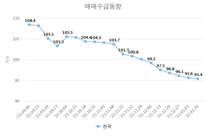 매매수급지수는 부동산원의 회원 중개업소 설문과 인터넷 매물 건수 등을 분석해 수요와 공급 비중을 지수화한 수치다. 지수가 기준선인 100 아래로 떨어지면 집을 팔겠다고 내놓은 집주인이 사겠다는 주택수요자보다 많다는 것을 의미한다.
