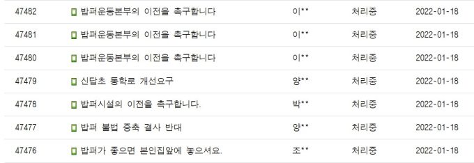 동대문구청 홈페이지에 올라온 ‘밥퍼시설의 이전을 촉구합니다’라는 제목의 글을 보면 민원인은 “동대문구 주민들은 꾸준히 밥퍼의 이전을 요구하였으며 이미 34년이라는 오랜 기간 동안 밥퍼의 활동으로 인해 수많은 불편함을 견뎌 왔다. 배식하는 시간에는 동대문구뿐만 아니라 서울전역에서 노숙인들이 몰려 소음이 발생하고 도시락을 받거나 식사를 하기 편하다보니 아예 밥퍼 근처에서만 노숙하는 인원이 점점 늘어나고 있다”고 지적했다.