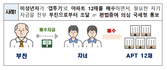 미성년자 A씨는 아파트 12채를 보유하고 있다. 그가 보유한 아파트는 공시가격 1억원 이하 지방 저가 아파트들이다. A씨가 보유한 아파트 12채의 구입자금은 모두 갭투자(임대보증금을 승계하고 차액만 지불하는 방식)와 아버지 계좌에서 나왔다. 국토교통부는 A씨 일가가 편법증여를 시도했다고 보고 세무조사를 위해 국세청에 이를 통보했다.