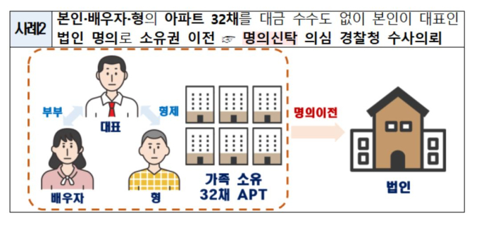 32채를 법인 명의로 돌려 다주택자 양도세 중과를 피한 의심사례도 있다. B씨는 저가아파트 32채를 본인이 대표인 법인에게 일괄매도하면서 매각 대금을 받지 않고 법인이 납부해야 할 취득세를 본인이 전부 부담했다.