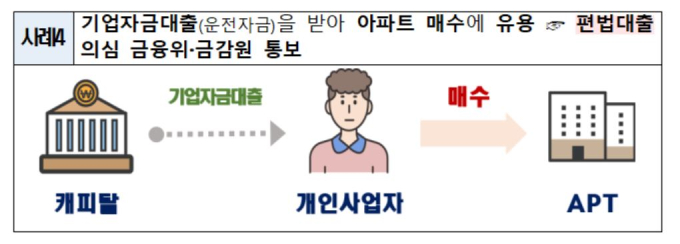 기업자금대출(운전자금)을 받아 저가 아파트 매수에 나선 의심사례도 적발됐다. 개인사업자 C씨는 여신전문업체(캐피탈)로부터 받은 기업자금대출을 저가아파트를 매수하는데 사용했다. 국토부는 이 거래를 대출용도 외 유용 의심사례로 금융위원회에 통보했고, 금융위는 대출 분석․조사를 통해 유용이 확정될 경우 대출금 회수조치에 나설 예정이다.