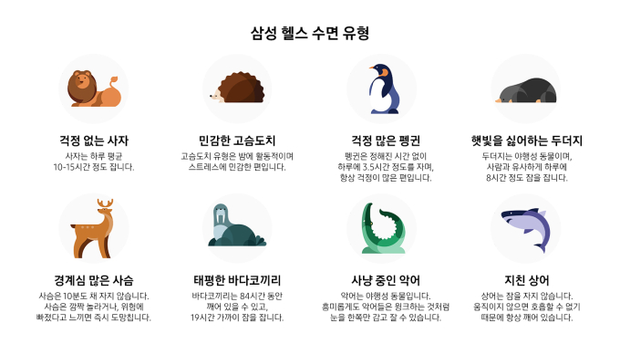이 프로그램은 7일 이상 수면 패턴과 2개 질문 답변을 종합해 사용자 수면 유형을 8가지 동물 유형으로 보여준다.