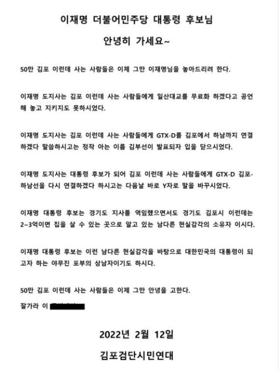 김포검단시민연대는 12일 “이재명 더불어민주당 대통령 후보님, 안녕히 가세요~”라는 제목의 지지철회문을 발표했다. 이는 이 후보가 전날 열린 2차 TV토론에서 김포에 아파트 조성원가를 고려해 20평대 아파트를 2~3억원대에 공급이 가능하다고 말한 것이 발단이 됐다.