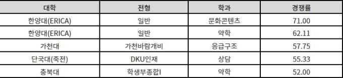 가장 높은 경쟁률을 기록한 곳은 한양대(ERICA) 문화콘텐츠학과로 일반전형 14명 모집에 무려 994명이 지원하여 71:1을 기록했다. 그 다음으로 높은 경쟁률을 기록한 곳은 역시 한양대(ERICA)의 약학과로 일반전형 9명 모집에 559명이 지원해 62.11:1의 경쟁률을 보였다. 그 이후로는 가천대 가천바람개비전형 응급구조학과 57.75:1, 단국대(죽전) DKU인재 상담 55.33:1, 충북대 학생부종합I 약학 52:1 등의 순으로 높은 경쟁률을 보였다.
