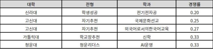 2022학년도 학생부종합전형 경쟁률 낮은 중계열 Top5. 출처 : 2022학년도 수시 학생부종합전형 경쟁률 자료 취합 후 재가공(2022년 2월 15일)