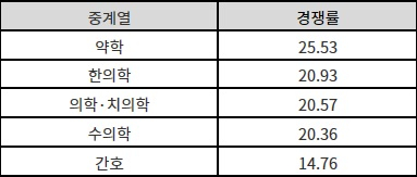 전국의 모든 학과를 기준으로 수험생들의 선호도를 살펴보는 것은 어려움이 있어, 중계열 기준으로 경쟁률을 분석한 결과 2022학년도부터 학부모집을 실시한 약학과를 중심으로 의학 계열의 경쟁률이 높은 특징을 보였다. 학과의 특성에 따른 중계열로 구분하여 경쟁률을 분석한 결과 약학계열이 25.53:1로 가장 높은 경쟁률을 보였고, 그 뒤를 이어 한의학 20.93:1, 의·치의학 20.57:1, 수의학 20.36 등이 20:1 이상의 높은 경쟁률을 기록했다. 의학계열 외에는 간호 14.76:1, 중등교육 13.94:1 등이 높은 경쟁률을 보여, 의학계열과는 큰 차이가 있었다.