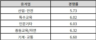중계열 기준 가장 수험생들의 선호도가 낮은 곳은 산업·안전 관련 모집단위였는데 평균 5.73:1의 경쟁률을 보였다. 해당 중계열 내에서는 최근 빅데이터 분석과 관련이 있는 산업정보시스템, 산업경영 등을 중심으로 10:1 이상의 높은 경쟁률을 보였으나 건설안전공, 안전보건 등의 학과에서 낮은 경쟁률을 기록해 해당 중계열의 평균 경쟁률은 높지 않았다. 그 다음으로 낮은 경쟁률을 보인 중계열 모집단위들은 특수교육 6.02:1, 인문기타 6.03:1, 중등교육/자연 6.32:1, 기계·교통 6.6:1 등의 순이었다.