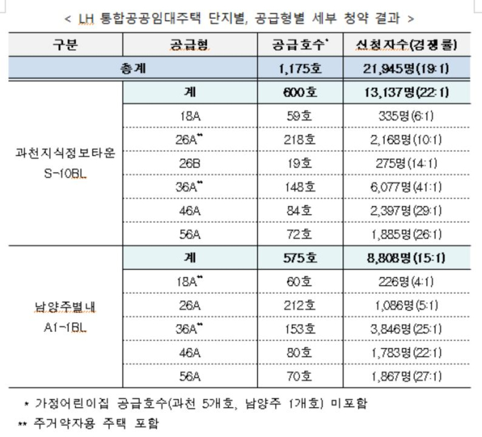 LH는 지난 15일부터 18일까지 과천지식정보타운 S-10BL 605호 및 남양주별내 A1-1BL 576호를 대상으로 청약접수를 실시했다.