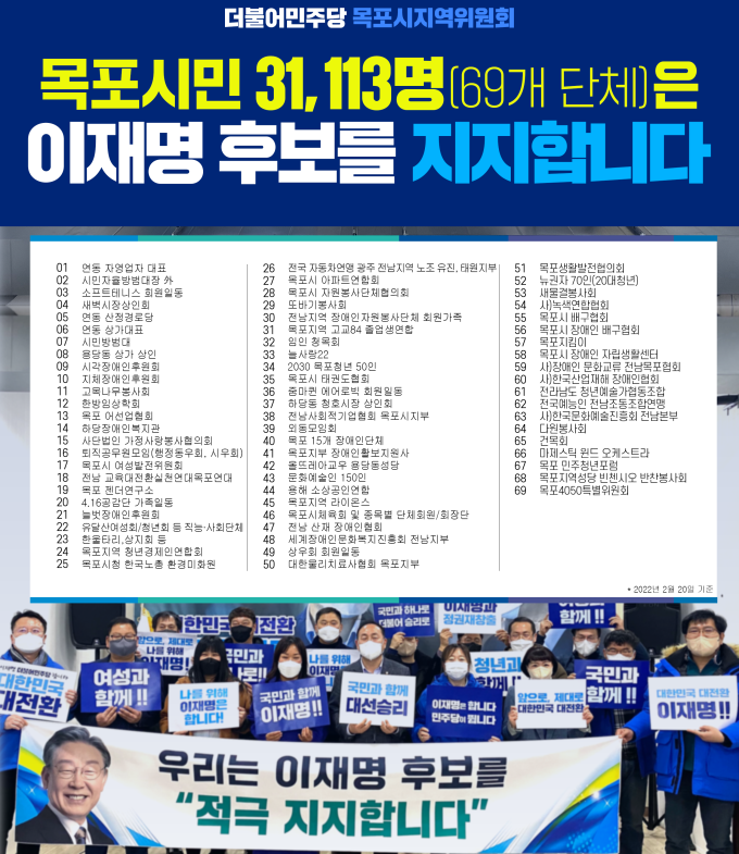 지지 선언 참여자들은 “코로나19의 신속한 극복과 민생경제 회복을 이뤄내고, 지방균형발전을 힘있게 추진할 적임자는 이재명 후보”라며 “이재명 후보의 승리를 위해 끝까지 함께 할 것”이라고 밝혔다.