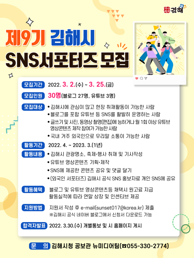 김해시가 지역과 시정 홍보 첨병역할을 할 'SNS서포터즈'를 모집한다.
