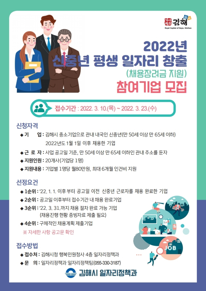 김해시가 2022년 신중년 평생일자리창출(채용장려금 지원) 사업 참여기업을 모집한다.