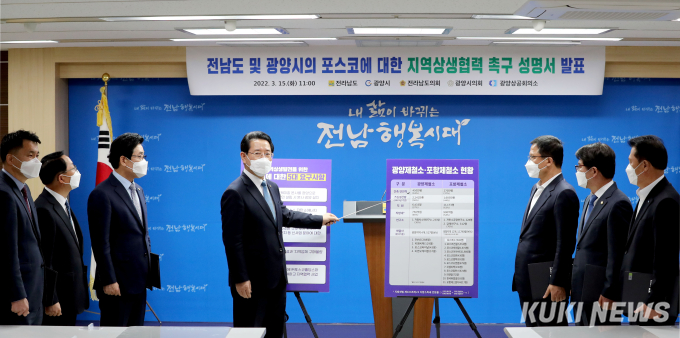 전남도는 15일 오전 도청 브리핑룸에서 이들 기관과 함께 포스코 지주사 포항 이전과 관련, 전남도‧광양시와 상생협력을 촉구하는 성명을 발표했다.