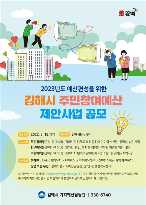 김해시가 내년도 시 예산 편성에 주민들이 직접 참여하는 '주민참여예산 제안사업'을 시행해 눈길을 끈다.