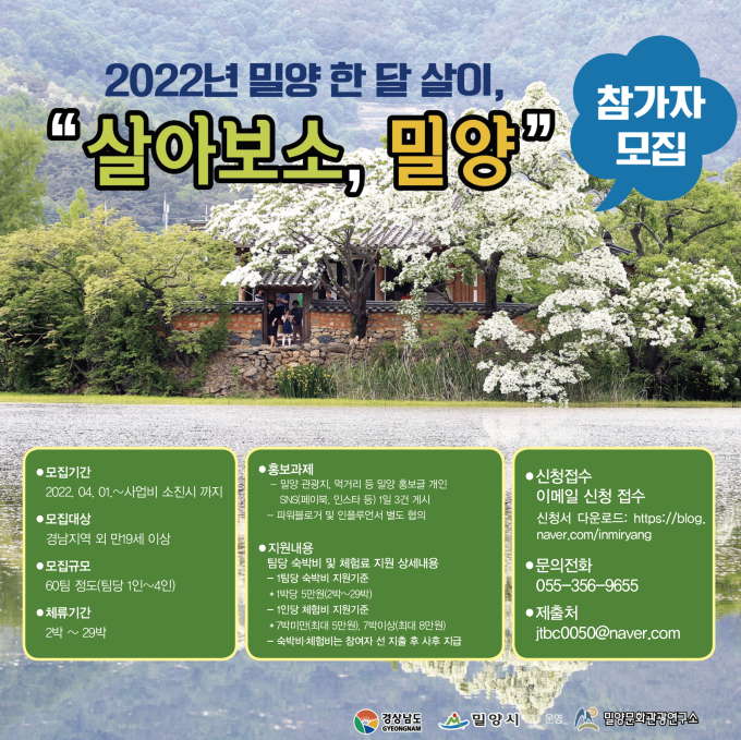 밀양시가 4월 1일부터 '관광도시 밀양'의 진수를 보여주고자 '밀양 한 달 살이' 참여자를 모집한다.