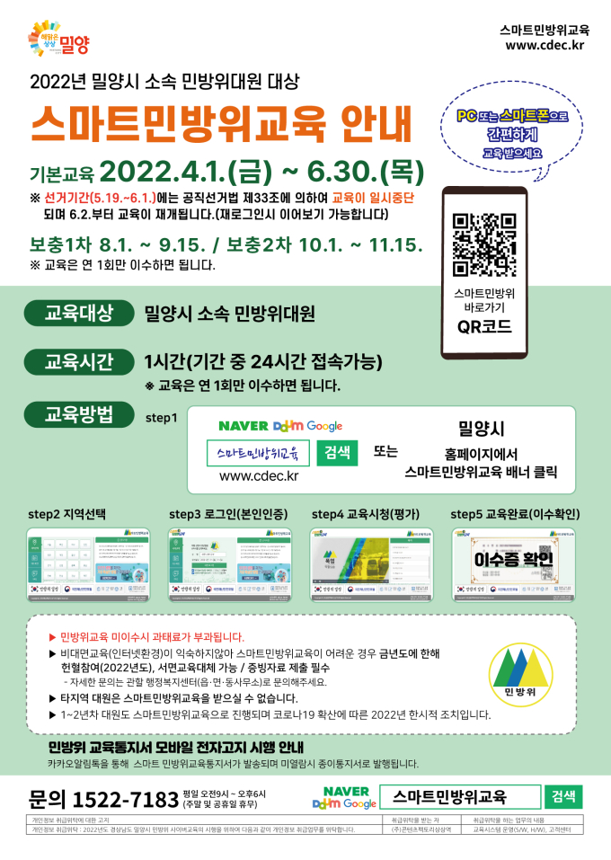 사이버 교육 수강방법은 컴퓨터나 스마트폰으로 인터넷 포털이나 밀양시 홈페이지를 통해 '스마트민방위교육센터(https://www.cdec.kr)'에 접속해 민방위 사이버교육 1시간 수강 후 과목별 평가점수 70점 이상이면 교육을 이수한 것으로 처리한다.