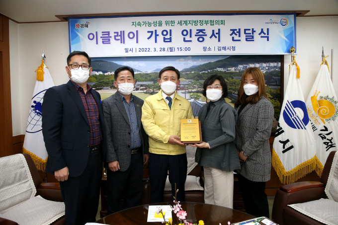 28일 김해시장실에서 진행한 지속가능발전 국제네트워크 '이클레이(ICLEI)' 가입인증서 전달식에는 허성곤 시장과 박연희 이클레이 한국사무소장 등 5명이 참석했다.