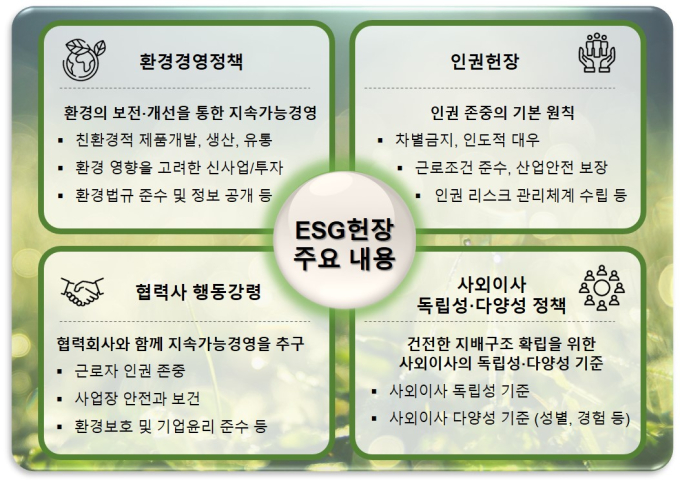 ESG경영 강화에 대한 확고한 의지를 대내외에 표명하기 위한 차원으로 환경경영정책, 인권헌장, 협력사 행동강령, 사외이사 독립성 및 다양성 정책 등 4개 분야 ESG 규범을 신규 제정했다.