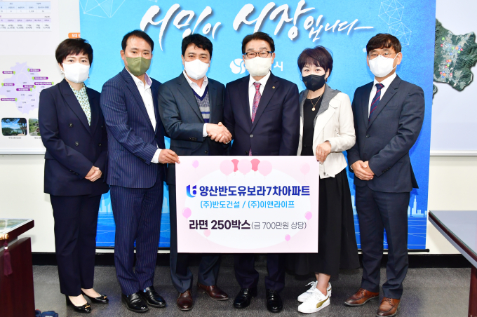 ㈜반도건설과 ㈜이앤라이프가 지난 5일 라면 250박스(1만개 700만원 상당)를 양산시에 전달했다.