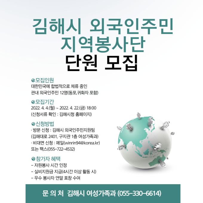 김해시가 김해지역 외국인들의 일상적 삶에서 '첨병' 역할을 수행할 '2022 김해시 외국인주민 지역봉사단'을 모집한다'