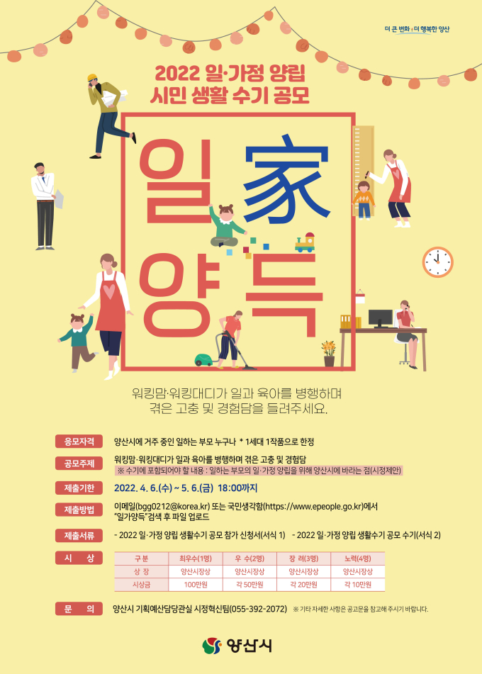 양산시는 워킹맘과 워킹대디가 일과 육아를 병행하며 겪은 다양한 '일 가정 양립 생활수기 알가양득' 공모를 진행한다.
