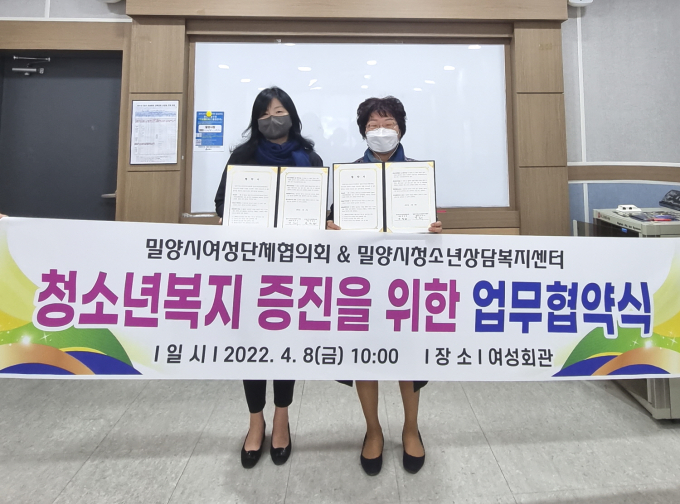 밀양시여성단체협의회(회장 백정화)와 밀양시청소년상담복지센터(센터장 박숙이)가 8일 여성회관에서 청소년복지 증진 지원을 위한 업무협약을 체결했다.