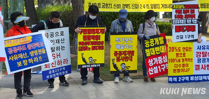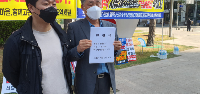 공공재개발을 반대하는 서울시내 14개 구역 비상대책위원회(비대위) 연합은 이날 오전 10시 서울시청 본관 정문 앞에서 공공재개발 반대 기자회견을 열고 오세훈 서울시장에게 진정서를 제출했다. 이날 기자회견에는 흑석2, 금호23, 신설1, 홍제동3080 고은산서측, 강북5, 신길1, 신길2, 신길4, 양평13, 거여새마을, 흑석10, 신길15, 영등포역세권, 숭인1169구역 등 14개 구역에서 사업에 반대하는 주민들이 참석했다.