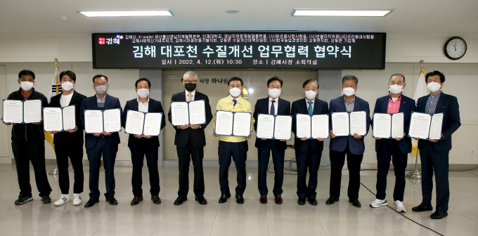 김해시는 12일 시청 소회의실에서 낙동강 유역 지류 하천인 대포천의 수질 개선을 위해 한국수자원공사와 인제대학교, 경남지역문제해결플랫폼 등 11개 '민 관 공 학'과 업무협력 협약을 맺었다.