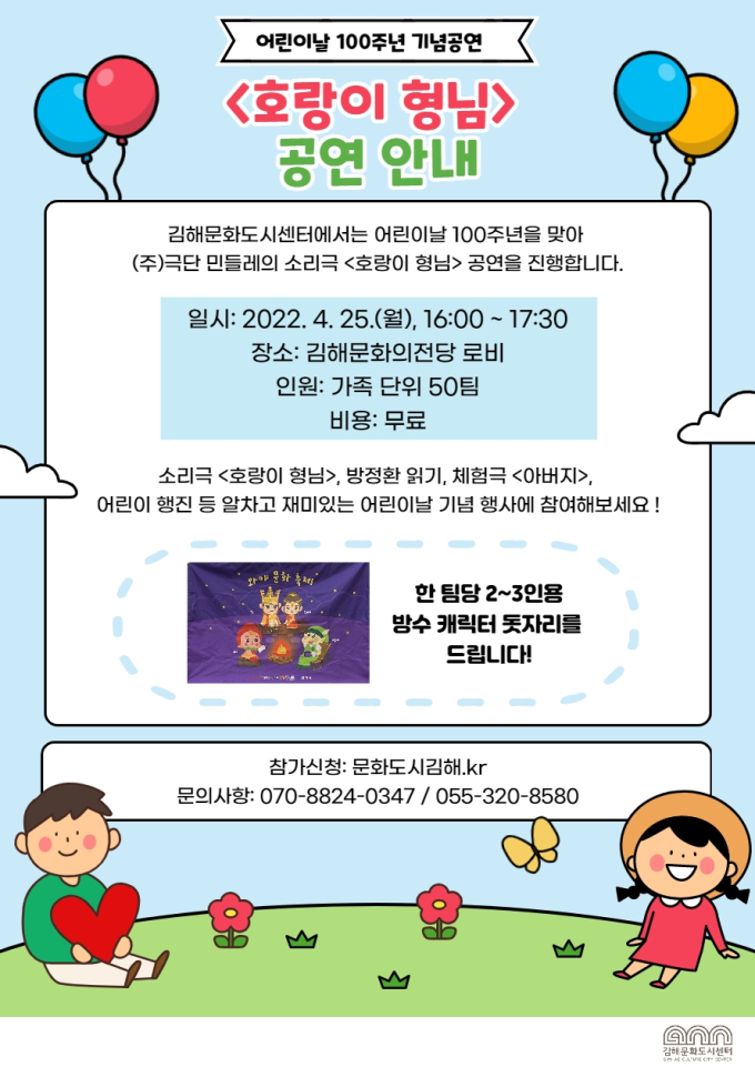 (재)김해문화재단 김해문화도시센터가 어린이날(100주년)을 기념하고자 오는 25일 ㈜극단 민들레의 소리극 <호랑이 형님> 공연을 진행한다.
