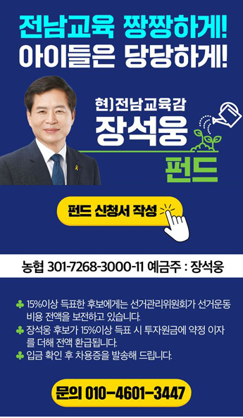 장석웅 예비후보는 “우리 아이들을 중심에 둔 전남의 혁신교육이 계속되길 바라는 도민들의 마음을 십시일반으로 모아 투명하고 깨끗하게 선거비용을 마련하겠다”며 “변화와 위기를 미리 대비하고 극복해 온 사람만이 전남교육을 중단없는 미래로 전진시킬 수 있다”고 강조했다.