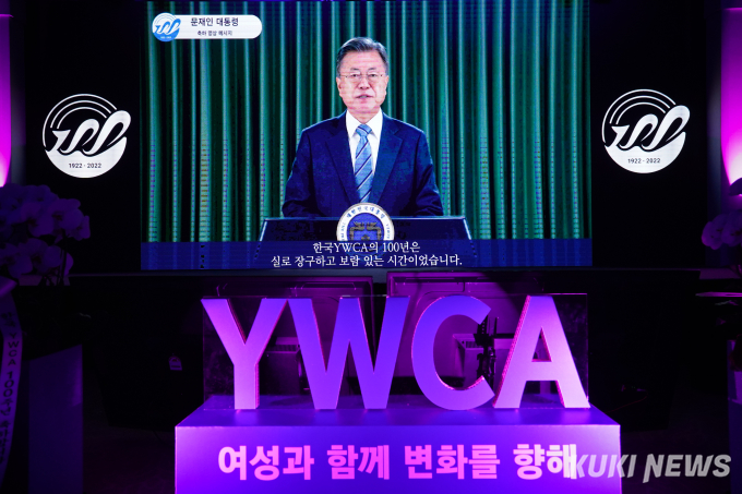 20일 서울 용산구 백범김구기념관에서 열린 한국 YWCA 창립 100주년 기념식에서 문재인 대통령 축하영상 메세지가 상영되고 있다.