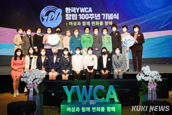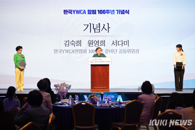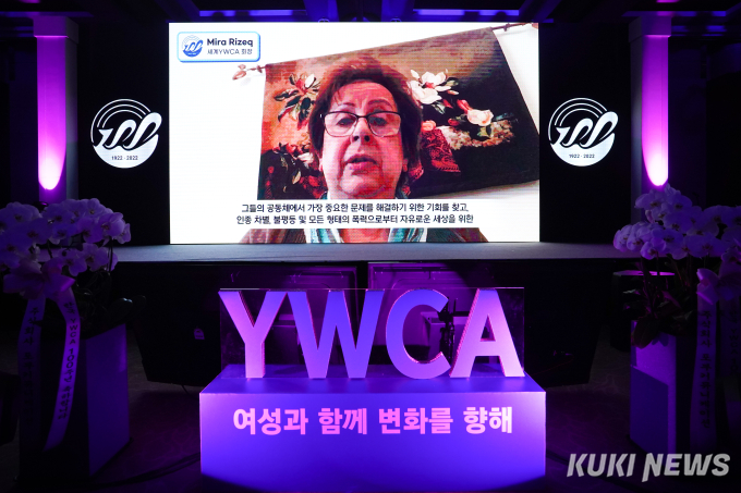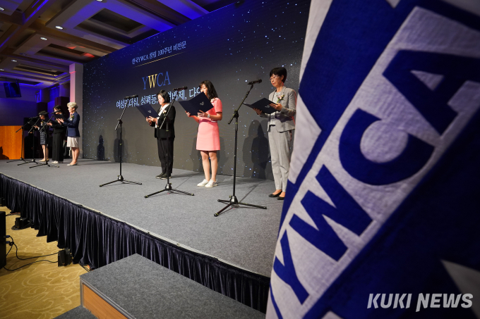 20일 서울 용산구 백범김구기념관에서 열린 한국 YWCA 창립 100주년 기념식에서 한 참석자가 문재인 대통령 축하영상 메세지를 찍고 있다.20일 서울 용산구 백범김구기념관에서 열린 한국 YWCA 창립 100주년 기념식에서 Mira Rizeq 세계YWCA 회장 축하영상 메세지가 상영되고 있다.(왼쪽부터)김숙희, 원영희, 서다미 공동위원장이 20일 서울 용산구 백범김구기념관에서 열린 한국 YWCA 창립 100주년 기념식에서 기념사를 하고 있다.20일 서울 용산구 백범김구기념관에서 열린 한국 YWCA 창립 100주년 기념식에서 참석자들이 비전문 선포를 하고 있다.20일 서울 용산구 백범김구기념관에서 열린 한국 YWCA 창립 100주년 기념식에서 참석자들이 기념촬영을 하고 있다. 임형택 기자 taek2@kukinews.com