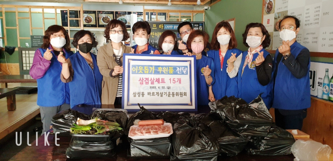 양산시 삼성동 바르게살기운동위원회(회장 정영주)가 삼겹살 15세트를 삼성동행정복지센터(동장 김경아)에 전달했다.