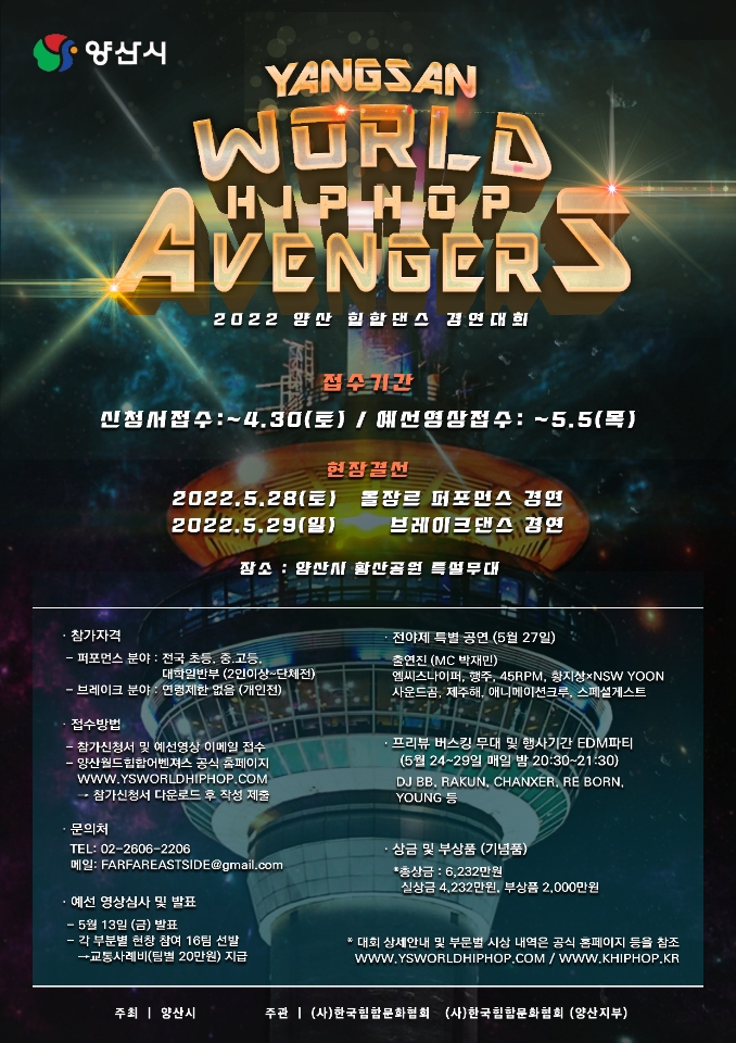 양산시가 오는 5월27일부터 3일간 양산 황산공원에서 개최하는 '2022 양산 월드 힙합 어벤져스'힙합 경연대회 참가자를 모집한다.