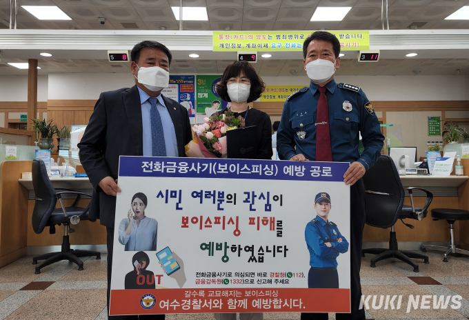 정성록 여수경찰서장은 “세심한 관찰로 주민의 소중한 재산을 지켜낸 직원에게 감사드린다”며 “보이스피싱 피해방지를 위해 개인의 각별한 주의와 금융기관 종사자의 관심이 무엇보다 중요하며, 경찰과 금융기관이 지속 협업해 보이스피싱 예방에 주력하겠다”고 말했다.