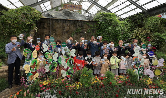 이병용 전남 함평군수 권한대행, 김형모 함평군의회 의장, 자광어린이집 원생 등이 나비생태관에서 나비날리기 체험을 진행하고 있다.