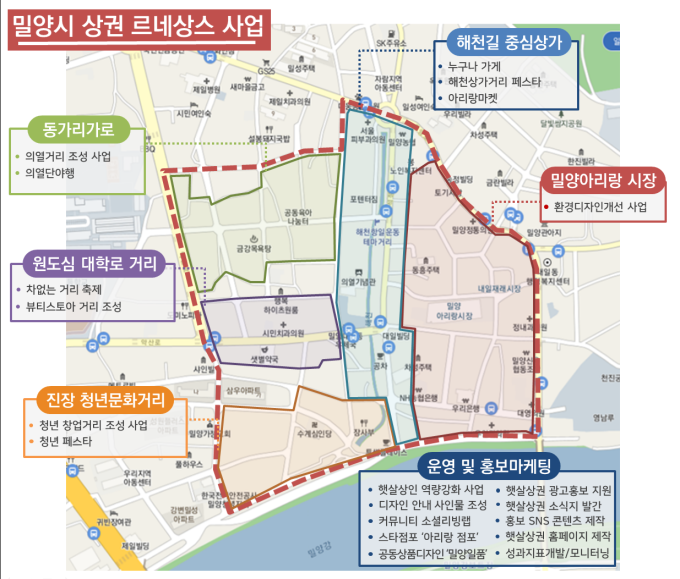 이 사업은 역사와 인물, 문화를 테마로 상권구역을 설정하고 밀양아리랑시장과 해천길 중심상가 거리, 원도심 대학로 거리, 진장 청년문화 거리, 동가리 가로 거리로 구역을 특성화해 사업을 진행한다.
