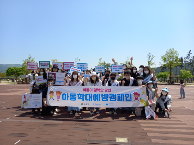 양산시와 양산시아동보호전문기관이 지난 5일 황산공원에서 온 오프라인으로 아동학대 예방 캠페인을 벌였다.