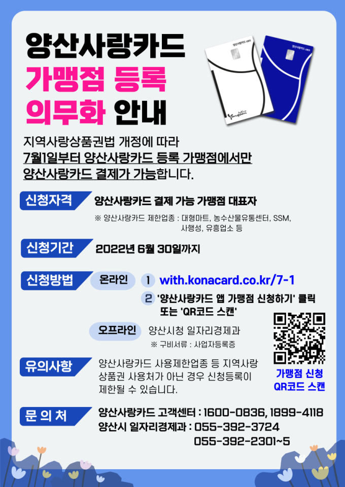 하지만 지역사랑상품권법 개정에 따라 양산사랑카드 가맹점 등록을 하지 않은 사업장은 7월 1일 이후부터는 양산사랑카드로 결제를 할 수 없다.