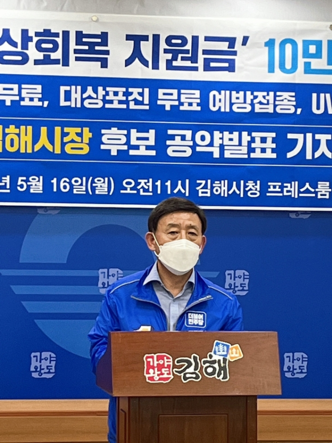 허성곤 더불어민주당 김해시장 후보가 16일 "당선되면 모든 김해시민에게 1인당 10만원의 일상회복 지원금을 지급하겠다"고 밝혔다.