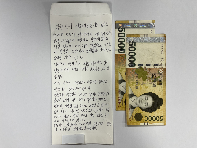 더불어 감사의 편지에 병원비로 사용하고 남은 돈 10만원을 "(저)보다 더 어려운 이웃을 위해 써달라"며 동 사무소에 전달했다.