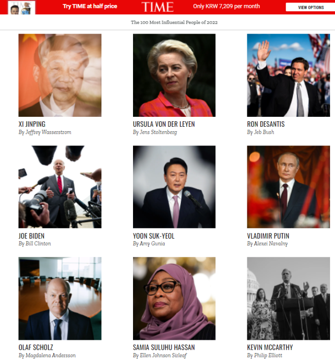 윤석열 대통령이 미국 시사주간지 타임지가 선정하는 ‘2022 세계에서 가장 영향력 있는 인물 100인’에 들었다.