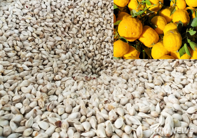 유자씨는 유자 과실의 30~35%를 차지하고 있어, 유자청과 생과 착즙 등 가공 과정에서 분리돼 산업폐기물로 배출되는 양이 연간 1800톤 이상에 달한다.