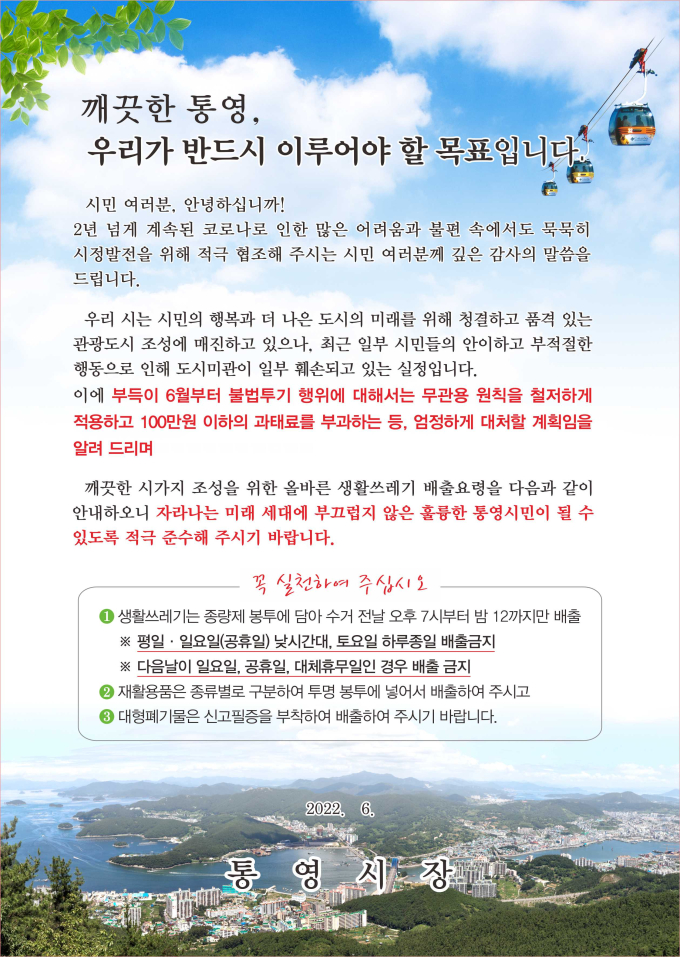이번 서한문 배포는 불법투기 근절을 당부하고 청결하고 품격있는 관광도시 통영을 건설을 위한 시민들의 자발적 참여를 촉구하기 위해 시행됐고, 배포한 서한문에는 불법투기 행위 근절을 위한 시민 한 사람 한 사람의 의지와 자발적 실천의식이 모이면 주민 불편을 최소화하고 더불어 깨끗한 환경을 지킬 수 있음을 호소하는 내용을 담고 있다.
