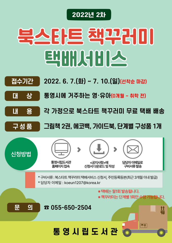 1차 도서관 접근성이 취약한 섬지역 및 다문화가정 영·유아를 대상으로 택배서비스 신청·접수 했으며, 2차 통영시 관내 영·유아를 대상으로 범위를 확대해 시행하게 됐다.