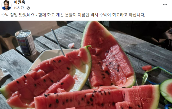 이원욱 민주당 의원은 10일 자신의 페이스북에 수박 사진을 게재했다. 그는 “수박 정말 맛있네요~ 함께 하고 계신 분들이 여름에는 역시 수박이 최고라고 하십니다”라는 글을 함께 올렸다.