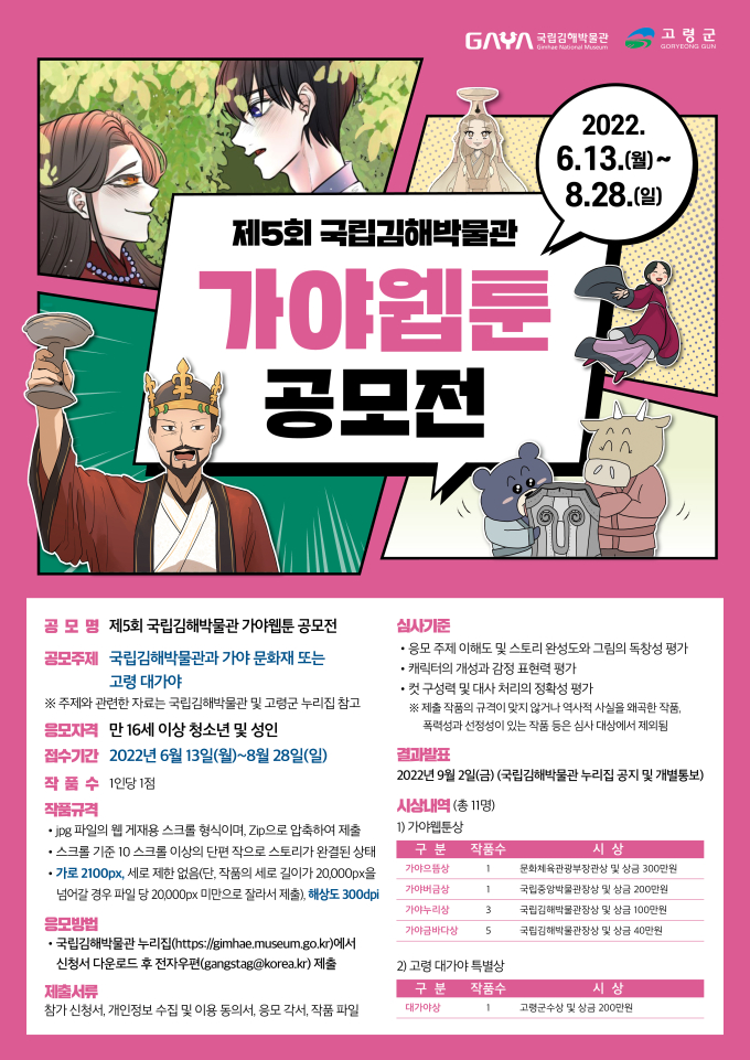 2018년부터 진행 중인 웹툰 공모전은 올해 5회째를 맞아 고령군과 공동으로 기획했다. 박물관 측은 이번 공모전에 가야 역사와 문화를 소개하고 현대적 감성으로 재해석한 다양한 작품들이 참여하기를 기대하고 있다.