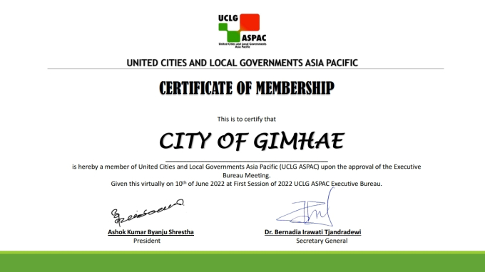김해시는 "지난 9일과 10일 중국 시안에서 개최한 '세계지방정부연합 아시아태평양지부(UCLG ASPAC) 집행부회의'에서 최종 가입이 승인됐다"고 14일 밝혔다.