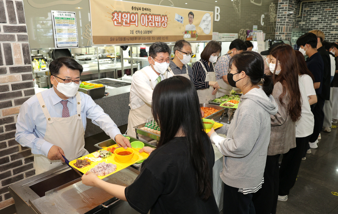 '1000원의 행복'이란 이 행사는 지난 13일과 14일 오전 다인식당에서 진행했다. 행사에는 전민현 총장과 대학 보직교수들이 나서 직접 학생들에게 아침 식사를 배식하면서 상호간 격의없는 소통을 이어갔다.