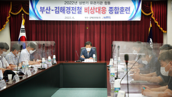 부산김해경전철이 지난 28일 본사 2층 회의실에서 '복합 재난 대비 2022년 비상대응 종합훈련'을 진행했다.